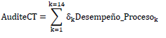 4. Se calcula el indice AuditeCT. Por último, se procede a estimar el índice AuditeCT mediante la suma ponderada del desempeño de los procesos. La siguiente es la expresión que permite estimar el índice AuditeCT en donde k es el sub índice que recorre los procesos claves que describen el desempeño de la contraloría territorial (en este caso son 14 procesos):