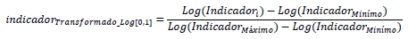 Por el contrario, cuando hay una gran diferencia en la escala es conveniente usar la misma transformación pero aplicando logaritmos (Departamento Nacional de Planeación, 2020). La función logaritmo - cualquiera que sea la base - tiene la ventaja de que transforma la escala cuando hay diferencias muy grandes entre el valor mínimo y el valor máximo del indicador. Un ejemplo del concepto “gran diferencia” se presenta cuando el valor mínimo es de 150 unidades y el valor máximo alcanza valores de 100.000.000 millones. La transformación tiene la siguiente expresión algebraica: