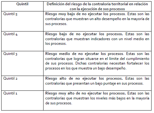 El razonamiento que conecta la dimensión cuantitativa con la cualitativa asociada al riesgo se basa en el siguiente hecho: si una contraloría se ubica en el quintil más bajo entonces tiene un mayor riesgo en el cumplimiento de su misión constitucional y legal y por lo tanto enfrenta un mayor riesgo de no ser certificada. En la siguiente tabla se muestran los niveles de riesgo: