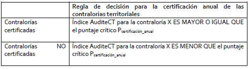 En el segundo contexto, el índice AuditeCT brinda información sobre la certificación de las contralorías territoriales. La certificación se realiza a partir de un puntaje crítico de certificación anual de las contralorías Pcert¡ícac¡ón_anual. Dicho valor será comparado con el índice AuditeCT. La regla de decisión es la siguiente: