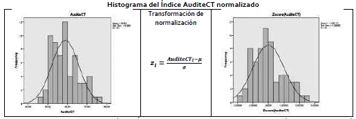Nota: El proceso de transformación del Índice AuditeCT se hace a partir de la aplicación de la normalización de la variable con el fin de aprovechar las propiedades de la normal N(0,1). La transformación lo que hace es restar la media a cada valor del AuditeCT y luego se divide por la desviación típica de la distribución original del Índice AuditeCT.