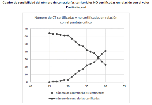 Así, la gráfica de sensibilidad del número de contralorías territoriales NO certificadas en relación con el valor Pcert¡ficaci¿n_anua¡ entrega una información acerca del posible comportamiento del número de contralorías territoriales que NO serían certificadas en función del Pcertificación_anual para el primer ejercicio de certificación. Estos resultados son relevantes en relación con el impacto del ejercicio porque un puntaje convencionalmente modesto en la escala [0,100] - es decir 60 puntos - tiene como consecuencia la no certificación de la mayoría de las contralorías territoriales. Por lo anterior, es conveniente fijar el primer valor crítico de certificación en 50 puntos, lo que guarda coherencia con lo calculado en el numeral 17 del capítulo “MÉTODO PARA EL CÁLCULO DEL VALOR CRÍTICO DE CERTIFICACIÓN”.