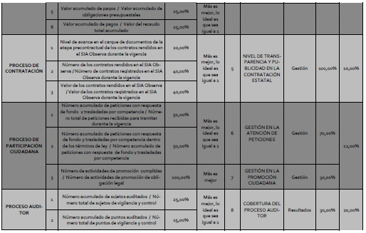 Hay otras fuentes de datos como el SECOP y el DANE. En este caso se procede a descargar los datos que permiten construir el indicador. Por ejemplo, los documentos de los contratos que las contralorías territoriales publican en el SECOP deben coincidir con los documentos de los contratos que las mismas entidades deben rendir en el SIA Observa de la Auditoría General de la República. De igual manera, el número de habitantes de un departamento, distrito o municipio es una cifra que se puede obtener del DANE y es útil cuando se mide la cobertura de la promoción y la participación ciudadana. Una fuente adicional para la construcción de algunos indicadores son los informes que legalmente debe publicar cada contraloría territorial en su página web.