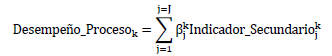 En donde el sub índice j hace referencia al número de indicadores secundarios del proceso k, el cual puede variar entre uno y J. El super índice k en la sumatoria hace referencia a que los ponderadores