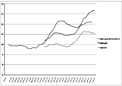 Las series de las cinco variables explicadas anteriormente se convierten a índice, tomando como mes base 100 el vigente para el Índice de Precios al Consumidor – IPC – DANE.