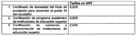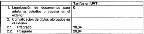 ARTÍCULO 13. CONVERSIÓN A UVT DE TARIFAS POR CONCEPTO DE LEGALIZACIÓN DE DOCUMENTOS EXPEDIDOS POR INSTITUCIONES DE EDUCACIÓN SUPERIOR COLOMBIANAS Y CONVALIDACIÓN DE TÍTULOS. Fíjese así la tarifa por concepto de legalización de documentos expedidos por instituciones de educación superior colombianas y la convalidación de títulos cursados u obtenidos en el exterior: