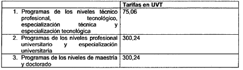 ARTÍCULO 11. CONVERSIÓN A UVT DE TARIFAS DE ESTUDIOS CONDUCENTES A LA CREACIÓN DE INSTITUCIONES DE EDUCACIÓN SUPERIOR. Fíjense así las tarifas por concepto de estudios conducentes a la creación de instituciones de educación superior oficiales, reconocimientos de personería jurídica de las instituciones privadas de educación superior, autorización de creación de seccionales, reconocimiento institucional como universidad, modificación del carácter académico, y redefinición para el ofrecimiento de programas por ciclos propedéuticos: