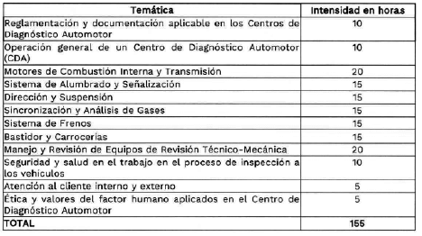 h) Demostrar que los empleados que realizan la labor de inspectores o técnicos operarios o su equivalencia recibieron formación del SENA o Instituciones de Educación Superior autorizadas por el Ministerio de Educación Nacional con personería jurídica y con registros calificados afines al sector transporte y tránsito, de mínimo 155 horas en temáticas de mecánica automotriz, procesos de revisión, manejo de los instrumentos de medición, las Normas Técnicas Colombiana NTC 5375, NTC 5385 y demás normas que se expidan sobre la materia. La formación no podrá ser compensada ni homologada por experiencia laboral. El Organismo Nacional de Acreditación de Colombia (ONAC) o quien haga sus veces verificará en cada una de las evaluaciones que el personal técnico e instructores recibieron la formación que trata el presente literal.