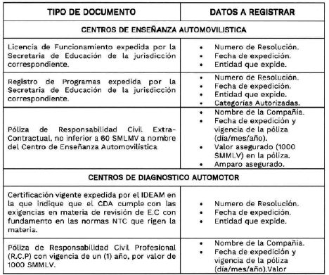 En este espacio se encontrarán datos como: Registro de Datos de personal autorizado en el caso de los Centros de Diagnóstico Automotor (COA), los literales e) y f) del artículo 3o de la presente resolución, los Centros de Enseñanza Automovilística (CEA), Registro de datos del personal profesional de la salud en el caso de Centros de Reconocimiento de Conductores y registro de los instructores de los Centros Integrales de Atención, Centros de Enseñanza Automovilística y Organismos de Tránsito para realizar cursos sobre normas de tránsito.