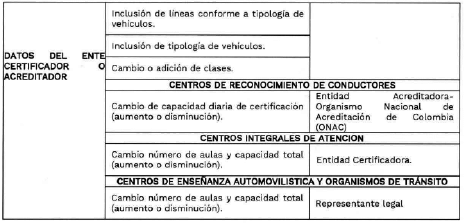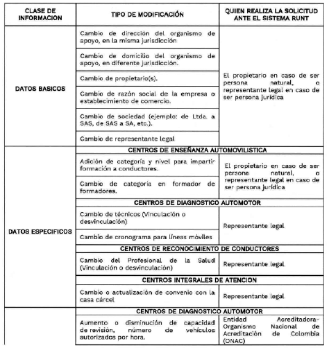Las modificaciones del registro de Organismos de Apoyo al Tránsito que estarán previstas en el sistema del Registro Único Nacional de Tránsito (RUNT) estarán clasificadas por clase, tipo y persona autorizada para realizar la solicitud, las cuales se describen a continuación: