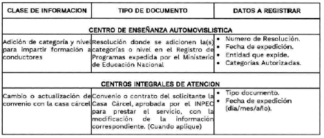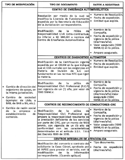 4. Registro de datos complementarios del Organismo de Apoyo. El propietario, o representante legal, deberá incluir en el sistema del Registro Único Nacional de Tránsito (RUNT) los datos adicionales que se requieran los cuales dependerán del tipo de modificación requerida la cual estará sujeta a la clase de información y solo para los casos que se indican a continuación: