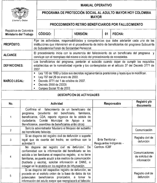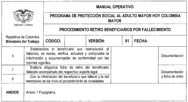 El Manual Operativo del Programa de Protección Social al Adulto Mayor, hoy Colombia Mayor fue actualizado durante la actual vigencia mediante Resolución 1370 del 2 de mayo de 2013, y en el artículo 2 del citado acto administrativo se previo que los ajustes que requiera el Manual Operativo se harán a través de anexo técnico elaborado por la Dirección de Pensiones y Otras Prestaciones del Ministerio del Trabajo.