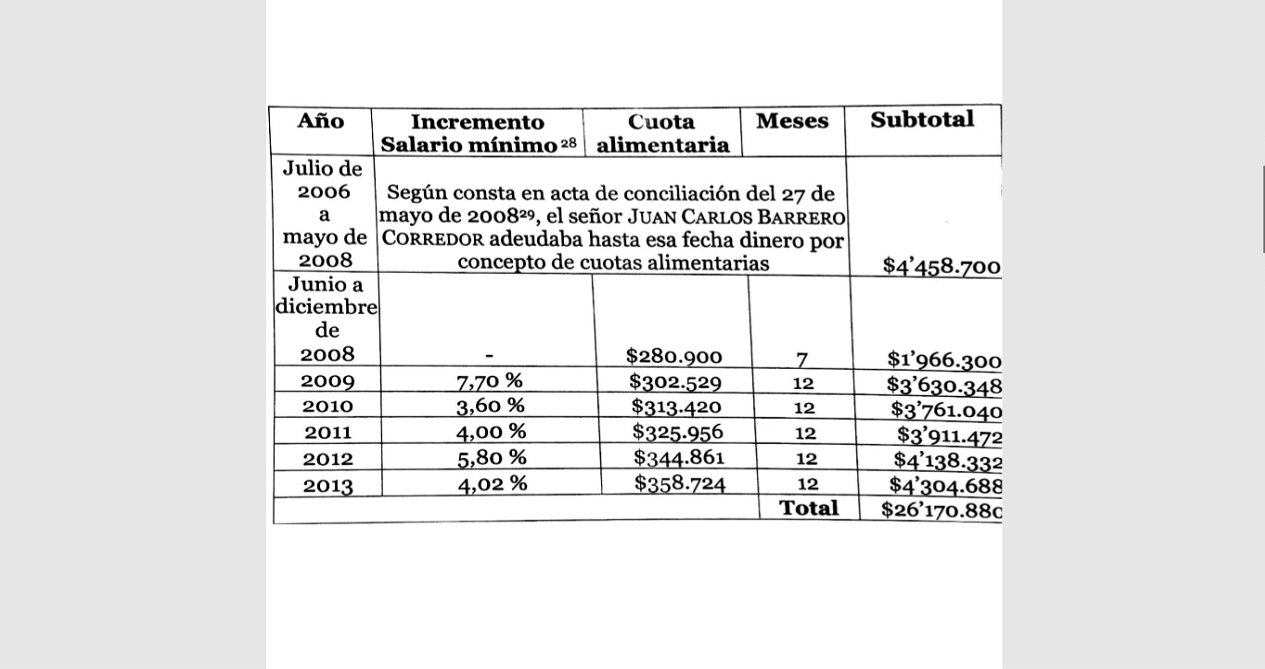 Con base en lo anterior, la Sala advierte que el monto total de la deuda de julio de 2006 al año 2013 asciende a $26.170.880.oo pesos, los aportes dinerarios del procesado, tan solo suman $3.400.000.oo pesos, con lo cual, como lo dedujo el Tribunal, BARRERO CORREDOR ha incumplido por concepto de alimentos con su menor hijo, en la suma de $22.770.880.oo pesos.