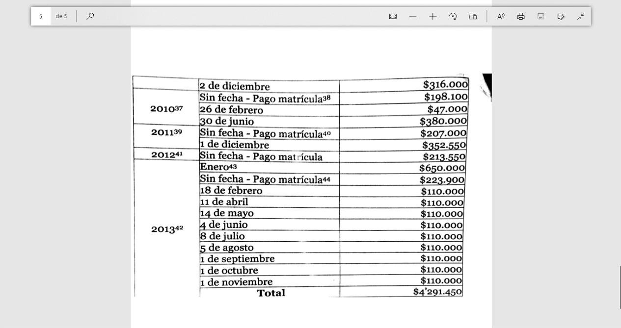 Hubo tres abonos probados en 2010 por valor total de $625.100.oo. Durante este periodo, el contrato educativo del menor ascendía a 1.978.100.o, con lo cual el procesado se hallaba obligado a cancelar exclusivamente por este rubro $989.050.oo.