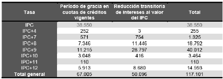 Que, de los 117.101 créditos mencionados, se observa que 38.550 obligaciones registran tasa de interés igual al IPC dentro de las condiciones de originación y 78.551 créditos presentan tasa de interés superior al IPC, tal como se evidencia en la siguiente tabla: