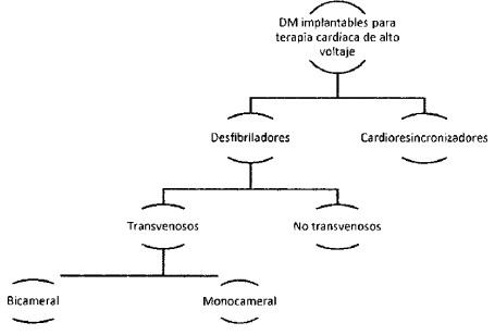 3.9. Dispositivos médicos implantables para terapia cardíaca de alto voltaje-desfibrilador transvenoso monocameral: generador de impulsos implantable, con un sistema de reconocimiento del ritmo cardíaco, que permite analizar un electrocardiograma y suministra un impulso eléctrico para desfibrilar el corazón (restablecer su ritmo normal) o disminuir la frecuencia cardíaca. Cuenta con derivaciones que se colocan dentro o sobre una cavidad cardíaca (normalmente, un ventrículo) para monitorizar los parámetros electrocardiográficos y brindar de forma automática el impulso eléctrico que permite tratar la fibrilación ventricular o la taquicardia. Incluye baterías internas que proporcionan la energía necesaria para suministrar las descargas, y se conoce habitualmente como cardioversor-desfibrilador implantable automático.