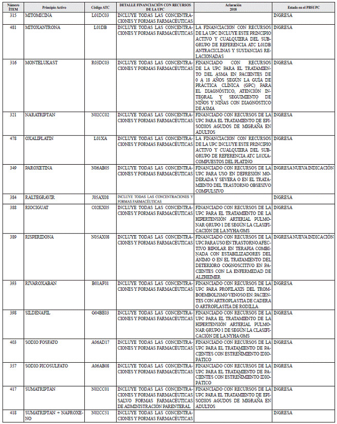 Para mayor ilustración, en el documento denominado “ANEXO NÚMERO 2. MEDICAMENTOS, USOS Y FORMAS FARMACÉUTICAS QUE INGRESAN A LA FINANCIACIÓN CON CARGO A LA UPC A PARTIR DEL 1 DE ENERO DE 2018”, se relacionan las inclusiones de nuevos medicamentos al Plan de Beneficios en Salud con cargo a la UPC y la expresión de medicamentos en nuevos subgrupos de referencia.