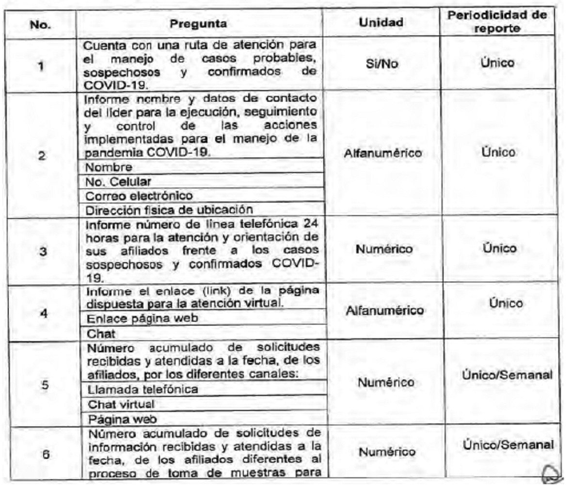 La información solicitada se debe reportar en los términos y condiciones definidos en la presente circular, la cual corresponde a la mínima requerida para realizar el seguimiento y monitoreo con el fin de evaluar la capacidad de respuesta de las ET y EAPB en la atención del evento, en lo relacionado con la detección temprana de casos, disponibilidad de recurso humano, embalaje, envió y procesamiento de muestras, así como entrega de resultados, entre otros.