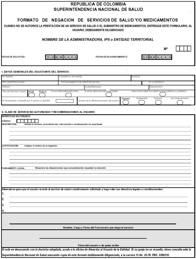 Una vez ha sido informado el afiliado en los aspectos antes señalados, deberá diligenciarse el formato de negación de servicios de salud y/o medicamentos (SNS-F:NSSM), anexo a esta circular, en forma completa, clara, legible, expedita y al momento mismo de la solicitud.