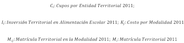 iii) Se estiman los cupos ofrecidos para cada entidad territorial en 2011, dividiendo su inversión en programas de alimentación escolar en 2011, de manera proporcional a la participación de la matrícula de cada jornada dentro de la matrícula total de la entidad en el mismo año; luego, los recursos proporcionales se dividen entre el costo anual (180 días) de la modalidad correspondiente a la jornada, estimado y validado por el ICBF para 2011, para obtener los cupos por jornada escolar. Sumando los cupos de cada jornada se obtienen los cupos de la respectiva entidad en 2011.