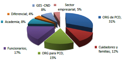 En este proceso se contó con la participación de PCD, sus familias y cuidadores y cuidadoras, representantes de organizaciones sociales de y para PCD y que trabajan en la garantía de sus derechos así como servidores y servidoras públicos/as de los niveles municipales, distritales, departamentales y nacionales. Los y las participantes (ver gráfica N° 3.1), reflexionaron sobre los principales problemas de la PCD para lograr su plena inclusión social, posibles alternativas de solución y finalmente se compartieron algunas experiencias relevantes sobre la acción pública en discapacidad.