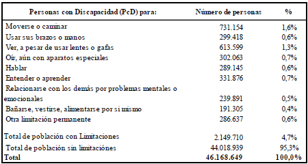 42. Si bien la fuente oficial de mercado laboral es la Gran Encuesta Integrada de Hogares – GEIH, esta fuente no reporta información sobre los tipos de limitaciones, motivo por el cual se emplea la información de fuerza trabajo de la ECV.
