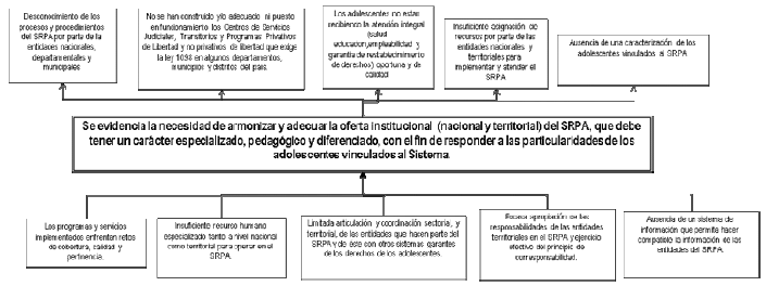 El país atraviesa por una etapa de transición en materia de enfoques, aprendizajes institucionales y políticas para el tratamiento del adolescente que han cometido conductas punibles. Requiere de ajustes institucionales y análisis sobre las dinámicas del Sistema para avanzar, de manera idónea, en acciones de atención y prevención. Así mismo, precisa de un mayor compromiso de las entidades territoriales en las políticas públicas a favor de la infancia y la adolescencia y de un ejercicio efectivo del principio de corresponsabilidad por parte de la familia.