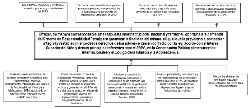 El presente documento identifica los principales problemas durante el proceso de implementación del SRPA y que son necesarios de subsanar para su idóneo funcionamiento. Se trata de asegurar una respuesta oportuna, pertinente y estratégica del Sistema, acorde a su finalidad, el carácter de sus medidas y los derechos de los adolescentes. En consecuencia, establece una serie de objetivos relacionados con los ejes problemáticos que caracterizan el proceso de implementación del SRPA. Así mismo jerarquiza y prioriza un catálogo de acciones conducentes al logro de tales objetivos, relacionadas con una oferta idónea de servicios para atender las demandas del Sistema y garantizar la efectividad de los derechos del adolescente, la formación especializada que requiere el recurso humano, los mecanismos de coordinación de las entidades que lo conforman y la armonización de sus sistemas de información. Adicionalmente, estima acciones que articulen el SRPA, con otros sistemas vigentes como el Sistema Nacional de Bienestar Familiar, SNBF, con las entidades territoriales corresponsables de la implementación del mismo y, en general, del Código de la Infancia y la Adolescencia. Finalmente, precisa los recursos institucionales requeridos para el SRPA.