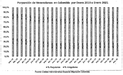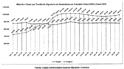 Que a pesar de los esfuerzos realizados por el Gobierno nacional mediante las medidas de flexibilización migratoria, de acuerdo con las cifras consolidadas por la Unidad Administrativa Especial Migración Colombia con corte a 31 de enero de 2021, el ingreso de migrantes venezolanos al territorio nacional con intención de permanencia continúa en ascenso y, desde el mes de septiembre de 2019, se evidencia que el número de migrantes venezolanos con estatus migratorio irregular corresponde a un porcentaje mayor que aquellos cuya situación se haya regularizado: