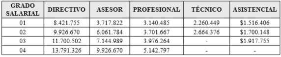 PARÁGRAFO 1o. En la escala de asignación básica fijada en el presente artículo, la primera columna señala los grados salariales correspondientes a las distintas denominaciones de empleos y la segunda columna indica la asignación básica mensual establecida para cada grado.