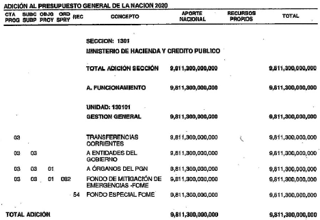 ADICIÓN AL PRESUPUESTO GENERAL DE LA NACIÓN 2020