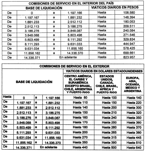 | GRADO | VIÁTICOS DIARIOS EN CIUDADES CAPITALES SEDE DE LAS ASESORÍAS REGIONALES DEL MINTRANSPORTE | VIÁTICOS DIARIOS PARA COMISIONADOS EN OTRAS CIUDADES O POBLACIONES |