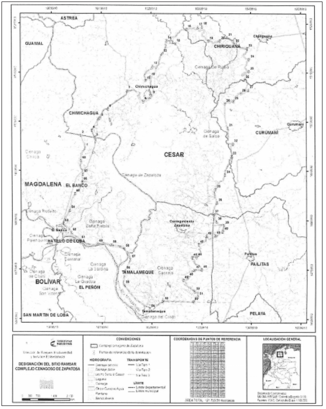 Artículo 2.2.1.4.10.1. Designación. Designar al Complejo Cenagoso de Zapatosa para ser incluido en la Lista de Humedales de Importancia Internacional, el cual se encuentra delimitado, según los estudios elaborados por el Ministerio de Ambiente y Desarrollo Sostenible, el cual comprende un área de 121.725,01 hectáreas aproximadamente de acuerdo con las siguientes coordenadas: