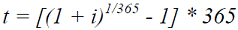 A continuación, la tasa efectiva anual de la tasa de interés aplicable deberá ser transformada a su equivalente nominal capitalizable diariamente a través de la siguiente fórmula: