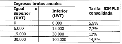 En el caso de los contribuyentes del impuesto unificado bajo el régimen simple de tributación – SIMPLE que sean responsables del impuesto sobre las ventas – IVA, presentarán una declaración anual consolidada del impuesto sobre las ventas – IVA, sin perjuicio de la obligación de transferir el IVA mensual a pagar mediante el mecanismo del recibo electrónico SIMPLE. En el caso de los contribuyentes del impuesto unificado bajo el régimen simple de tributación - SIMPLE que desarrollen actividades de expendio de comidas y bebidas, el impuesto al consumo se declara y paga mediante el SIMPLE.