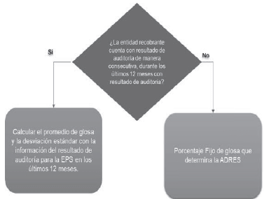 El procedimiento presentado en el Gráfico 1, aplica criterios simples de asignación de porcentaje de glosa estimada, según el riesgo inherente al pago, determinado por la historia de recobros de la entidad recobrante, así.