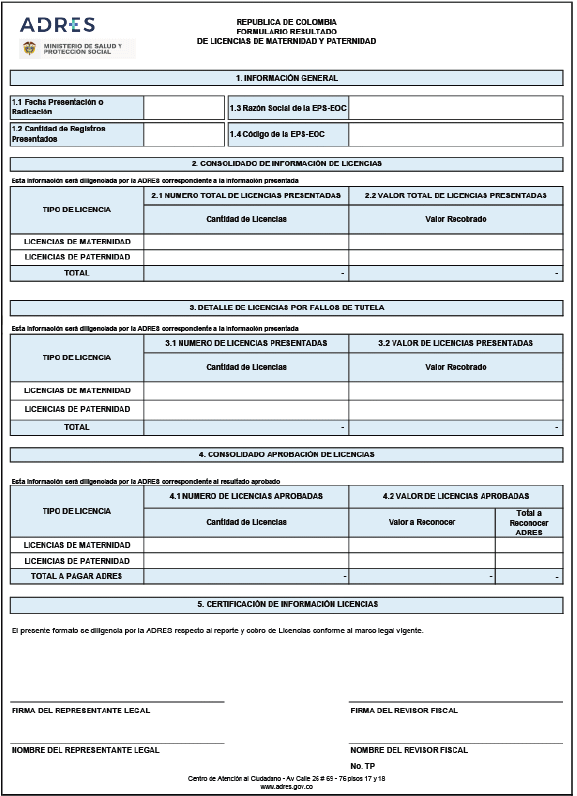2. Anexo técnico 2. Formularios de resultado de cobro de licencias de maternidad y paternidad. Corresponde a los formatos mediante los cuales se presentan los resultados consolidados del proceso.