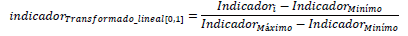 Ahora bien, dependiendo de las diferencias entre el valor máximo y el valor mínimo se pueden usar dos clases de transformación de escala; una lineal y otra usando logaritmos. La primera corresponde al uso de la transformación usada por el Departamento Nacional de Planeación y el Programa de Naciones Unidas para el Desarrollo que permite construir índices en los que se usan indicadores que tienen diferentes unidades de medición, pero en los cuales no hay grandes diferencias de escala: