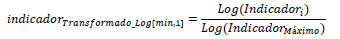 Por el contrario, cuando hay una gran diferencia en la escala es conveniente usar la misma transformación pero aplicando logaritmos (Departamento Nacional de Planeación, 2020). La función logaritmo - cualquiera que sea la base - tiene la ventaja de que transforma la escala cuando hay diferencias muy grandes entre el valor mínimo y el valor máximo del indicador. Un ejemplo del concepto “gran diferencia” se presenta cuando el valor mínimo es de 150 unidades y el valor máximo alcanza valores de 100.000.000 millones. La transformación tiene la siguiente expresión algebraica: