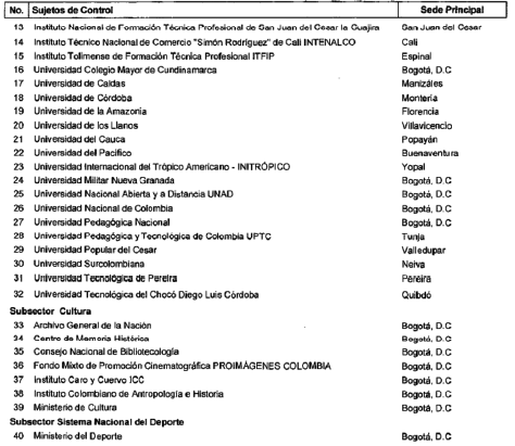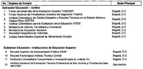 ARTÍCULO 6o. CONTRALORÍA DELEGADA PARA EL SECTOR EDUCACIÓN, CIENCIA Y TECNOLOGÍA, CULTURA, RECREACIÓN Y DEPORTE. <Resolución derogada por el artículo 32 de la Resolución REJ-EJE-0088 de 2021> La Contraloría Delegada para el Sector Educación, Ciencia y Tecnología, Cultura, Recreación y Deporte será competente para ejercer la vigilancia y el control fiscal a los siguientes sujetos de control: