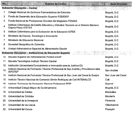 ARTÍCULO 6o. CONTRALORÍA DELEGADA PARA EL SECTOR EDUCACIÓN, CIENCIA Y TECNOLOGÍA, CULTURA, RECREACIÓN Y DEPORTE. <Resolución derogada por el artículo 33 de la Resolución REG-EJE-0097 de 2021> La Contraloría Delegada para el Sector Educación, Ciencia y Tecnología, Cultura, Recreación y Deporte será competente para ejercer la vigilancia y el control fiscal a los siguientes sujetos de control: