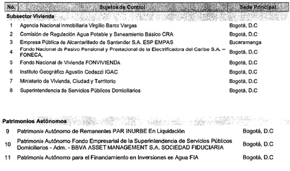 ARTÍCULO 15. CONTRALORÍA DELEGADA PARA EL SECTOR VIVIENDA Y SANEAMIENTO BÁSICO. <Resolución derogada por el artículo 33 de la Resolución REG-EJE-0097 de 2021> La Contraloría Delegada para el Sector Vivienda y Saneamiento Básico será competente para ejercer la vigilancia y el control fiscal a los siguientes sujetos de control: