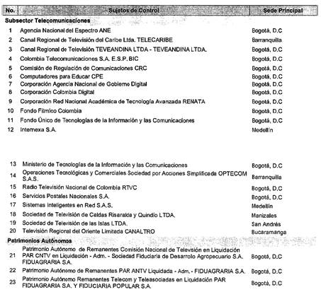 ARTÍCULO 4o. CONTRALORÍA PARA EL SECTOR DE TECNOLOGÍAS DE LA INFORMACIÓN Y LAS COMUNICACIONES. <Resolución derogada por el artículo 33 de la Resolución REG-EJE-0097 de 2021> La Contraloría Delegada para el Sector de Tecnologías de la Información y las Comunicaciones será competente para ejercer la vigilancia y el control fiscal a los siguientes sujetos de control: