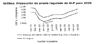 En efecto, la coyuntura se ha extendido a los precios del propano y el butano en Mont Belvieu, que de referencia del precio regulado del GLP. Como se observa en el Gráfico, las proyecciones realizadas por Ecopetrol con base en información de distintas agencias internacionales muestran una reducción abrupta en los precios regulados del GLP. De hecho, a la fecha se proyecta que el precio regulado de las fuentes del interior del país podría ser negativo en abril y mayo de 2020.