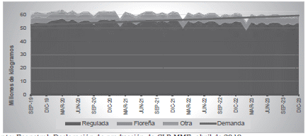 En relación con esto, en la gráfica que se presenta a continuación se establece el Potencial de Producción de GLP, diferenciando entre: i) las fuentes sujetas a libertad regulada, que corresponden a aquellas comercializadas por Ecopetrol; la producción denominada Floreña, fuente de producción que, hasta febrero de 2020, fue declarada como fuente de precio libre por un comercializador mayorista, TYGas, pero que, a partir de dicha fecha, es declarada por Ecopetrol; y las declaraciones de los demás productores. Teniendo en cuenta que la demanda de GLP en el país es de aproximadamente 52 millones de kilogramos al mes para atender 4,5 millones de usuarios, de acuerdo con el nivel de ventas reportado por los distribuidores al Sistema Único de Información – SUI, se hace una proyección de crecimiento anual y constante del 3%, a efectos de señalar el posible nivel de producto requerido para su atención.