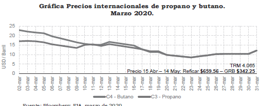 En la siguiente gráfica se presenta el comportamiento de los precios internacionales del GLP, propano y butano, para el mes de marzo;