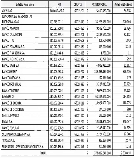 “Artículo 1o. Dar cumplimiento a lo estipulado en el Decreto Legislativo 518 de 2020 y la Resolución número 975 del 6 de abril de 2020 del Ministerio de Hacienda y Crédito Público “por medio de la cual se define el monto de los recursos a transferir, la periodicidad de las transferencias y los mecanismos de dispersión del Programa Ingreso Solidario, y se dictan otras disposiciones”, posteriormente modificada por las Resoluciones número 1022 del 20 de abril, número 1117 del 14 de mayo, número 1165 del 22 de mayo y número 1233 del 10 de junio de 2020, adoptadas por el Departamento Administrativo para la Prosperidad Social mediante la Resolución número 01215 del 6 de julio de 2020 modificada por la Resolución número 01329 de 22 de julio de 2020, y en consecuencia ordenar el pago de los recursos del Programa Ingreso Solidario a favor de las personas en situación de pobreza y vulnerabilidad que han sido relacionadas por el Subdirector General de Programas y Proyectos Encargado, mediante documento técnico radicado M-2021-4000-009044 del 19 de marzo de 2021, agrupados en la cuantía correspondiente a $373.012.640.000 (trescientos setenta y tres mil doce millones seiscientos cuarenta mil pesos) y entidades financieras que se indican en la siguiente tabla, con cargo a los recursos del Fondo de Mitigación de Emergencias (FOME), amparados en el certificado de disponibilidad presupuestal número 14021 del 15 de febrero de 2021.