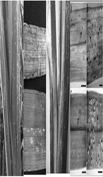 De izquierda a derecha: Figura1. Manchas blanquecinas y pústulas amarillas (uredos) en cebolla puerro Allium ampeloprasum. Figura 2 y Figura 3. Uredos en ajo Allium sativum. Figura 4. A. Uredos en ajo B. Telios (de color oscuro) en ajo. C. Picnidios. D. Aecios (Tomado de Anikster et al., 2004).