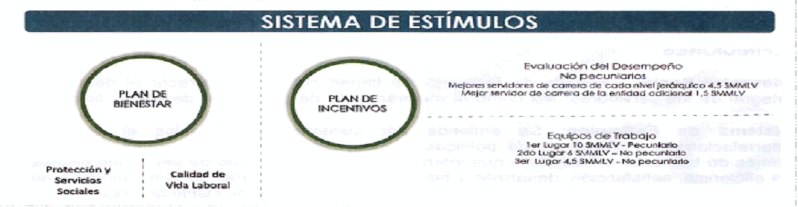 El Plan de Bienestar Social e Incentivos está compuesto por tres ejes: i) Calidad de Vida Laboral, ii) Protección y Servicios Sociales, y iii) Estar Bien es Bienestar, a través de los cuales se busca un desarrollo integral del servidor público, en sus aspectos personal, profesional y afectivo-familiar, rigiéndose por las normas que reglamentan el Sistema de Estímulos para los funcionarios del Estado, la Constitución Política de Colombia, el Decreto - Ley 1567 de 1998, el Decreto 1083 de 2015 y demás normas que lo modifiquen, adicionen o complementen; de igual manera, se trabaja en el fortalecimiento de estrategias para brindar salarios emocionales, con acciones que incidan directamente en el nivel de compromiso y motivación de los servidores.