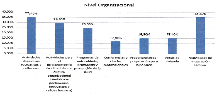 Nivel Organizacional ¿Qué actividades considera deben tener prioridad en el Programa de Bienestar Social? La actividad prioritaria para los servidores públicos es la de actividades deportivas, recreativas y culturales con un 35,40%, le sigue actividades de integración familiar con un 35,30%.